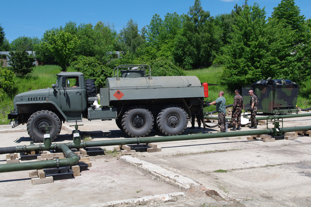 Připojování cisterny k potrubí v maďarském polním skladu paliva