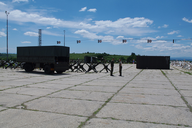 Volný prostor s kontejnery vytyčený ocelovými ježky bude muničním skladem