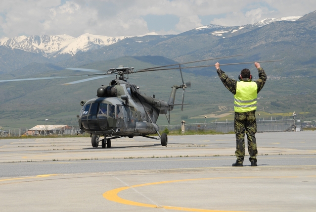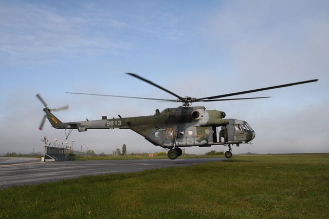 Vzlet dopravního vrtulníku Mi-171š z letištní plochy k plnění letového úkolu