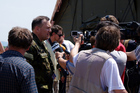 Plukovník Pelikán v obležení zástupců médií po tiskové konferenci na cvičení CL13