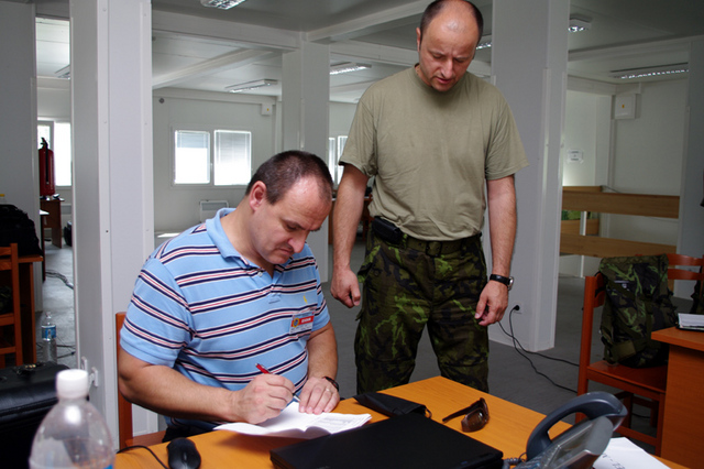 Jiří Vrba a podplukovník Šaraj při aktualizaci seznamů osob pro leteckou přepravu