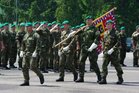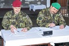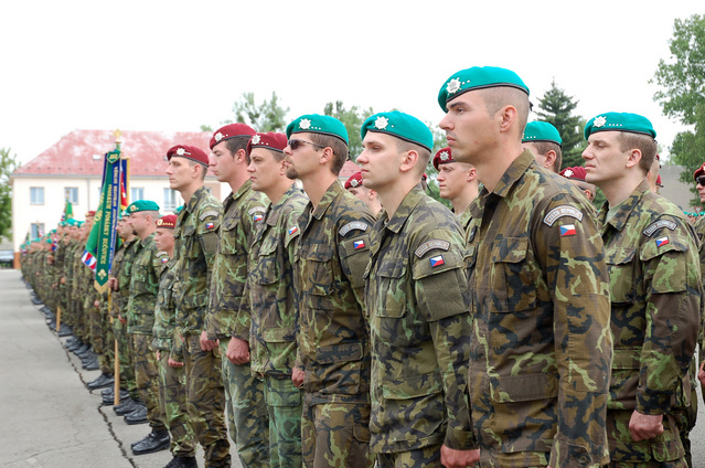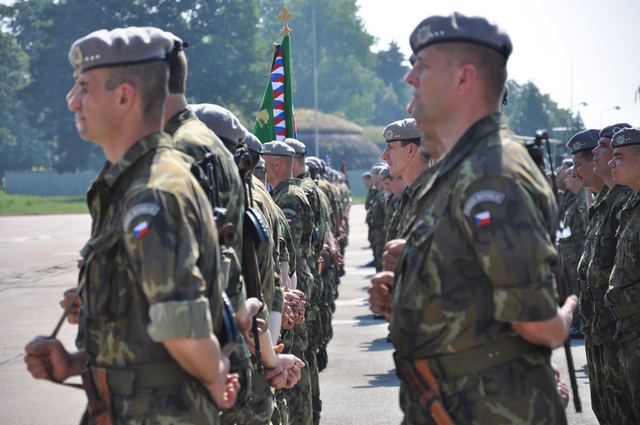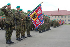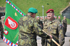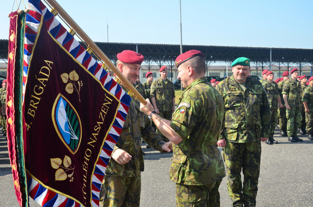 Symbolické předání bojového praporu 4. brigády rychlého nasazení v Žatci mezi plk. gšt. Miroslavem Hlaváčem, velitelem 4. brigády rychlého nasazení a brig. gen. Ladislavem Jungem