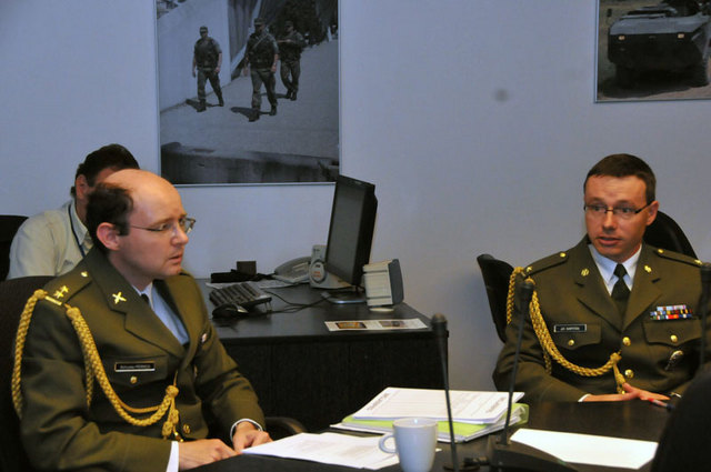 Zleva: podplukovník Bohuslav Pernica a major Jiří Kapitán informovali o získaných zkušenostech získaných prací v mnohonárodním velitelském štábu v Sarajevu