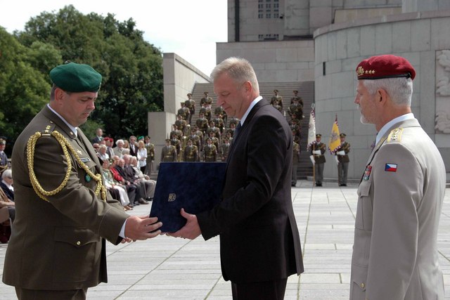 Velitel Vojenského geografického a hydrometeorologického úřadu přebírá dekret prezidenta republiky k propůjčení čestného názvu „Generála Josefa Churavého“