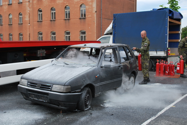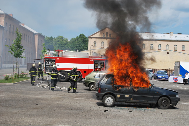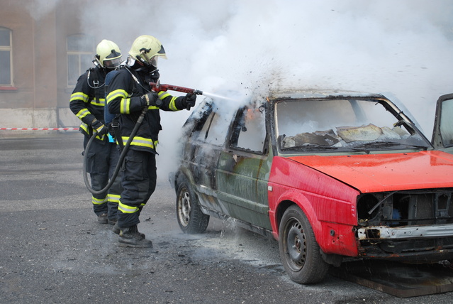 Všichni si vyzkoušeli použití hasičského přístroje při hašení hořícího automobilu