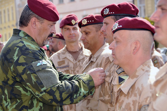 Medaile ministra obrany Za službu v zahraničí předává příslušníkům poslední jednotky českého provinčního rekonstrukčního týmu generál Vladimír Halenka