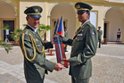 Velitel Školního praporu pplk.Jiroušek podává hlášení ZV VeV-VA plk.Honzákovi