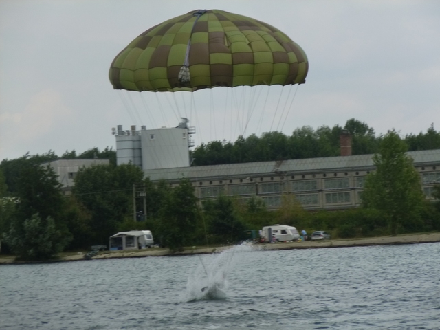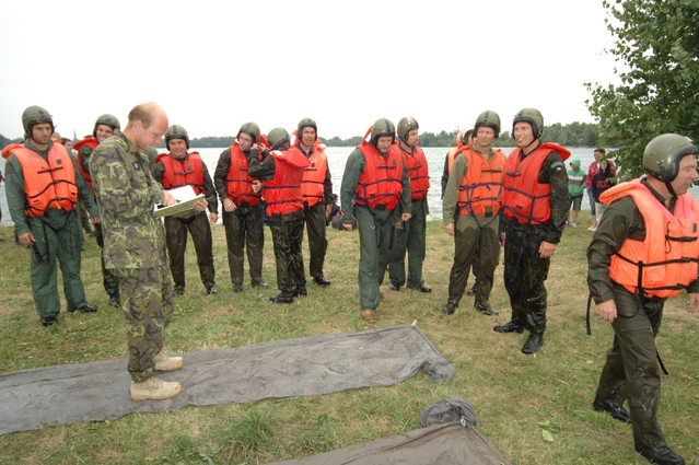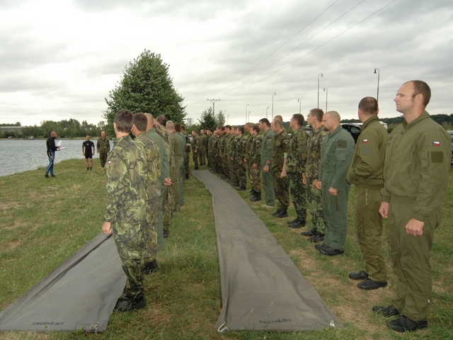 První skupinka vojáků při povinném namočení celé postavy a příprava hasičů před prvními seskoky