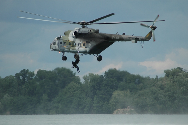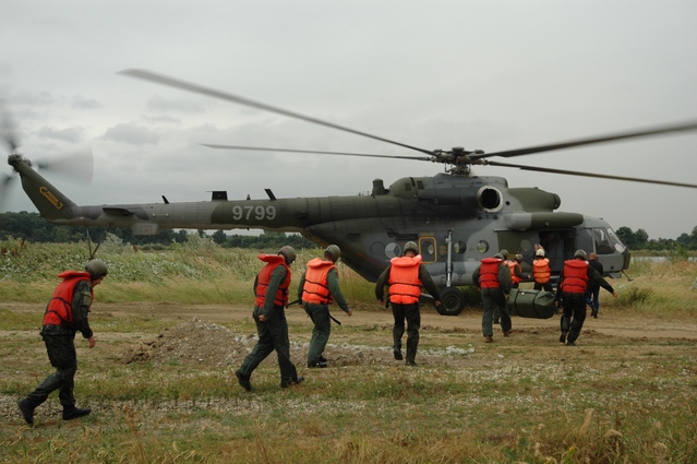 Nastoupení 12ti členné skupinky do dopravního vrtulníku Mi 171š z přerovské základny