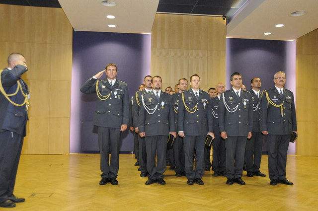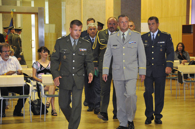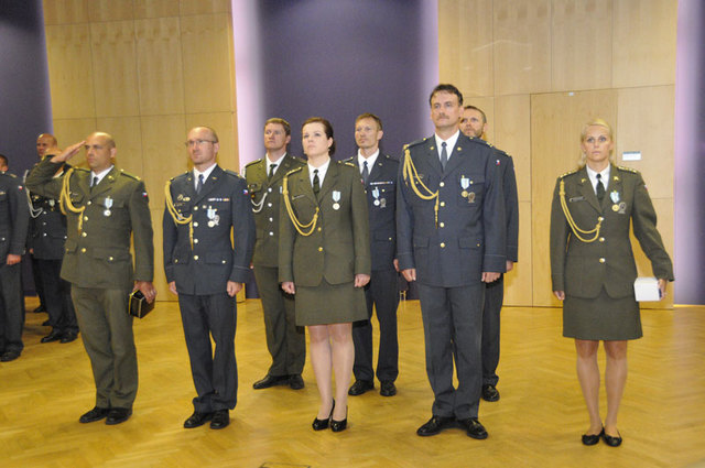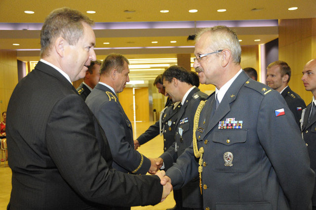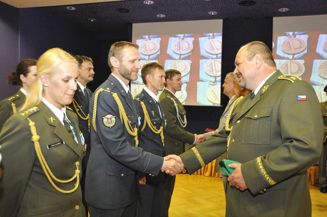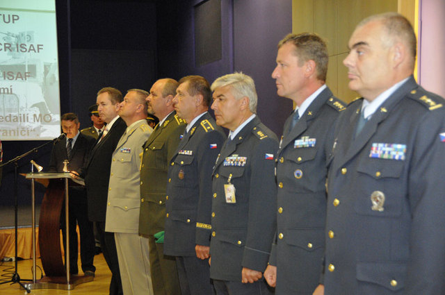 První zástupce náčelníka GŠ AČR generál Miroslav Žižka se spolu s náměstkem ministra obrany Liborem Karáskem chystá předat ocenění plukovníku Janu Holkovi, který velel vojákům, kteří působili na velitelstvích operace ISAF