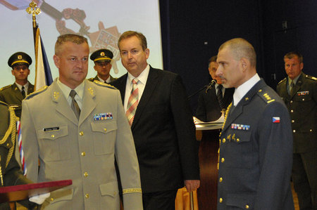 Kolegům letcům blahopřeje k uděleným medailím velitel základny z Náměště nad Oslavou plukovník gšt. Jiří Vávra