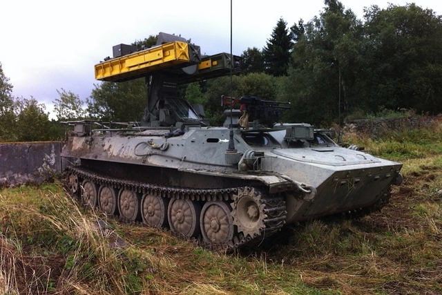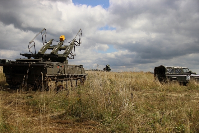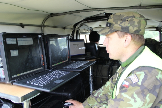 Emulátor umístěný na odpalovacím zařízení (vlevo), pracoviště simulačních technologií na vozidlu Landrover (vpravo), řídící a naváděcí radiolokátor SURN CZ (v pozadí).