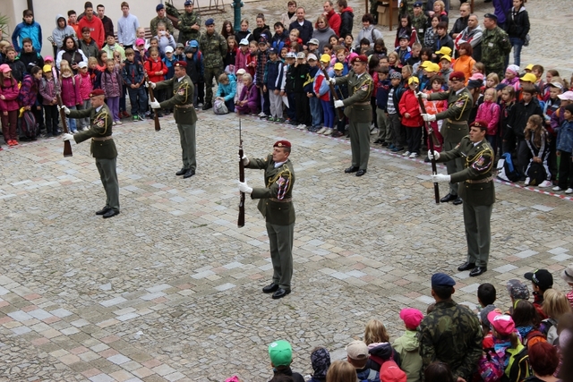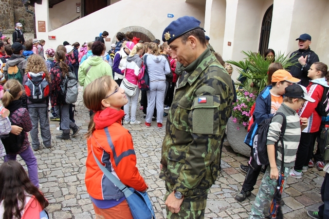 Mnozí školáci se na charitativní akci zdravili se svými rodiči – na fotografii příslušník strakonické brigády major Alan Dubový s dcerou.