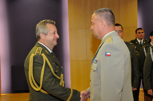 První zástupce náčelníka GŠ AČR generálmajor Miroslav Žižka předává medaili pplk. Davidu Schnábelovi. Ten pracoval jako vedoucí starší styčný důstojník - specialista národního zastoupení AČR v Norfolku