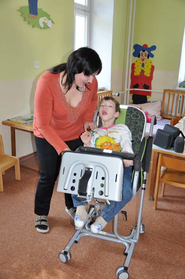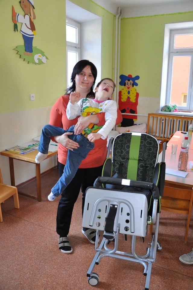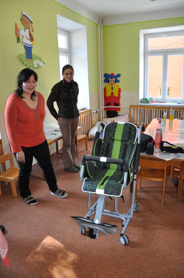 Jana Vévodová a paní asistentka ze Střediska rané péče při předání židličky