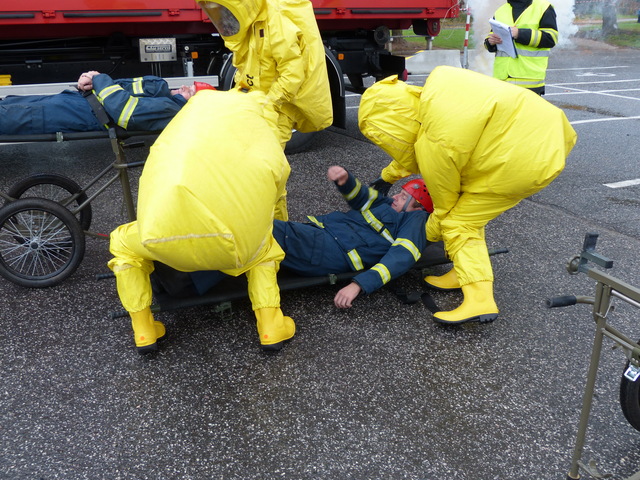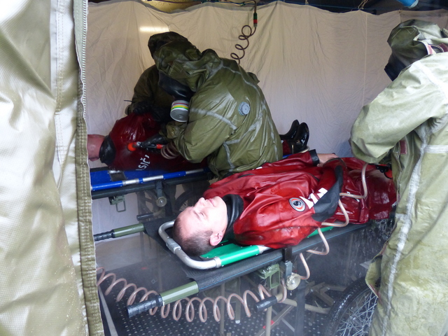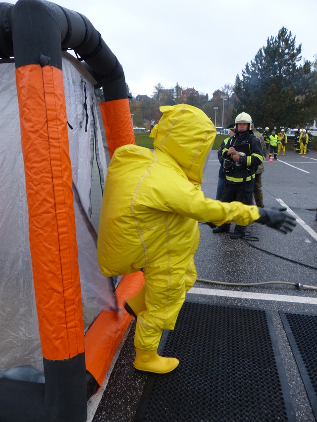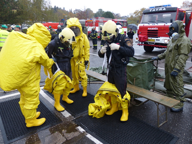 Před místem dekontaminace osob si cvičících odložili prostředky individuální ochrany