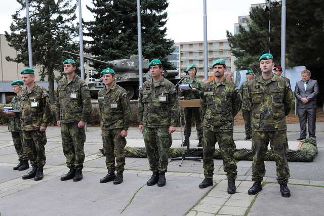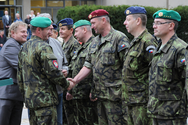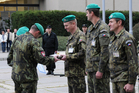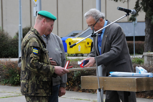 Vrchní praporčík Praporu zabezpečení Vyškov prap. Petr Rychnovský přebírá ocenění od pplk.v.v. Josefa Poláška