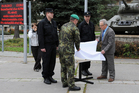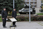 Vrhcní praporčík Petr Rychnovský přebírá z rukou ZV VeV-VA plk.Honzáka věcný dar za zásluhy o návrat tanku T-34 do vyškovských kasáren