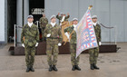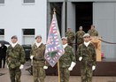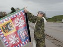 Vojenský kaplan 14. brigády zavěšuje stuhu na prapor 141. zásobovacího praporu