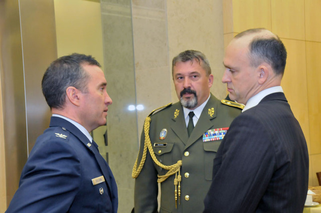 Před zahájením slavnostního nástupu se s plukovníkem Patrickem T. Sullivanem (vlevo) pozdravili generální sekretář Jan Vylita a zástupce náčelníka GŠ AČR generál Aleš Opata
