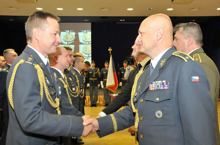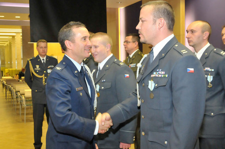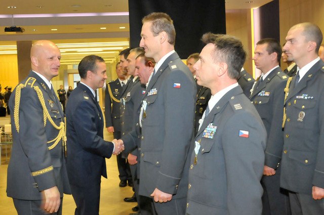 Vojenský zástupce ambasády USA v Praze plukovník Patrick T. Sullivan blahopřeje českým armádním letcům k medailím za úspěšné splnění afghánské mise