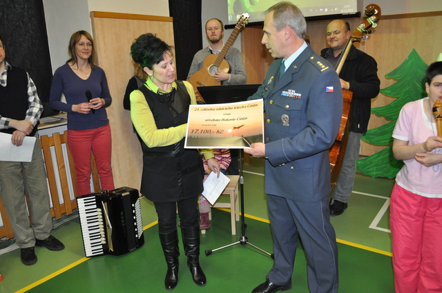 Plukovník Petr Hromek předává šek ředitelce Střediska Diakonie v Ćáslavi paní Květuši Mašínové