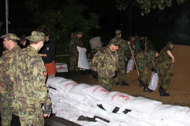 příslušníci pěší roty KVV Hlavní město Praha při nácviku stavby protipovodňových zábran