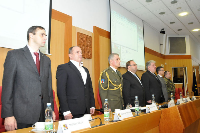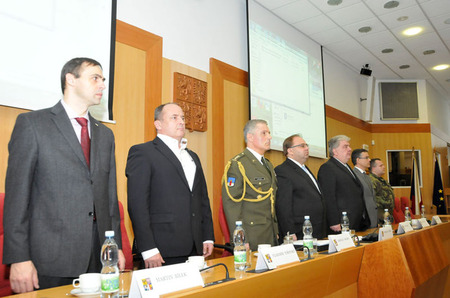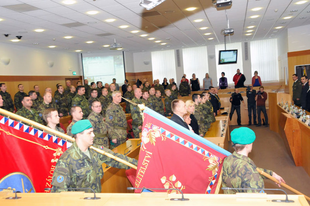 Slavnostní setkání na Krajském úřadě Moravskoslezského kraje v Ostravě bylo zahájeno přinesením praporů Krajského vojenského velitelství Ostrava a pěší roty Aktivní zálohy