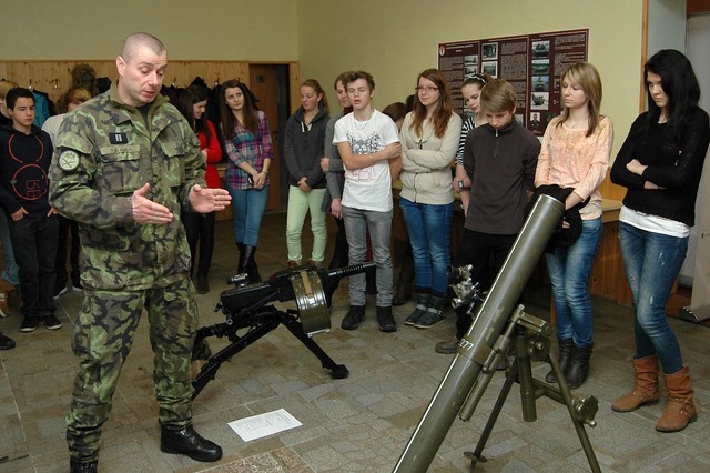 Příslušníci 74. lmopr prezentují studentům středních a základních škol v rámci výstavy LEGIE 100 dobové i současné zbraně.