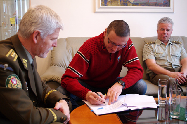 Generálporučík Petr Pavel a Jiří Brožek při podpisu smlouvy o zajištění veterinární péče pro psy Horské služby