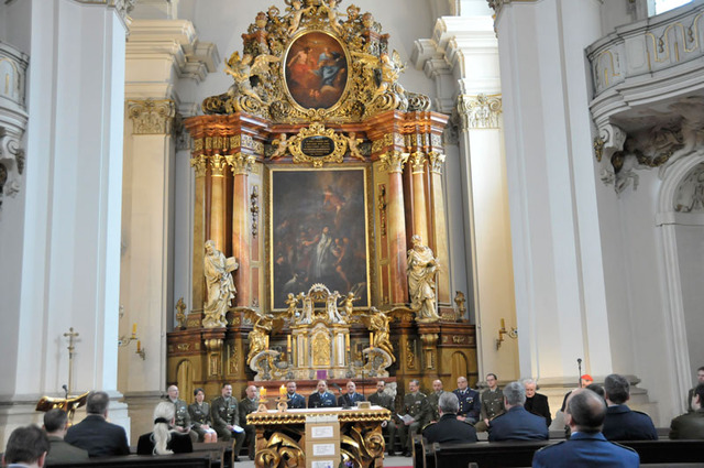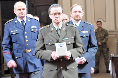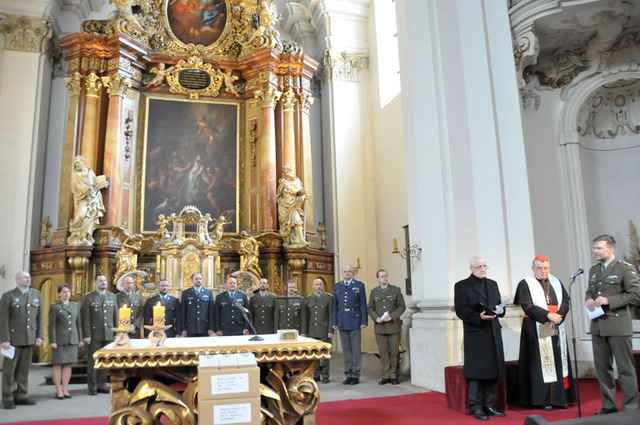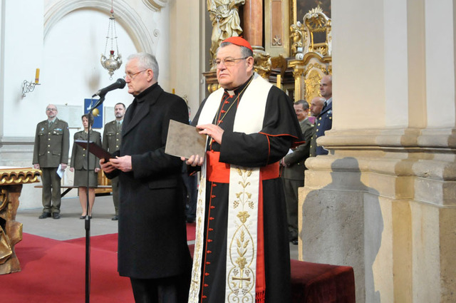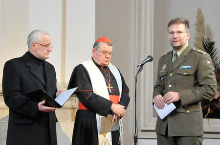 Předsedu Ekumenické rady církví v ČR Daniela Fajfra a předsedu České Biskupské konference kardinála Dominika Duku přivítal v kostele sv. Jana Nepomuckého hlavní kaplan AČR plukovník Jan Kozler