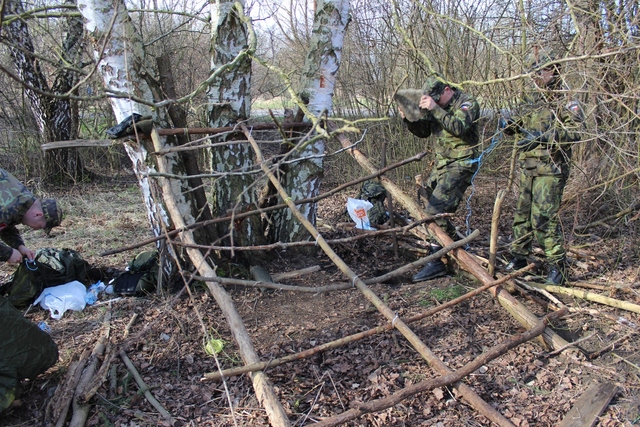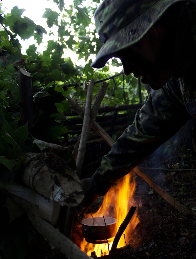 Součástí kurzu SERE je i mimo jiné vystavění přístřešku, založení různých typů ohnišť a příprava stravy