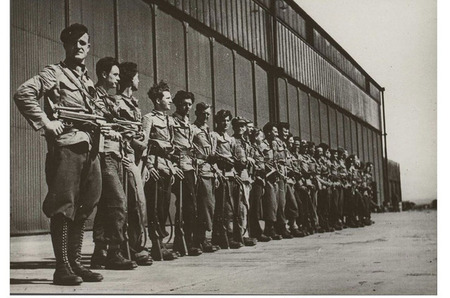 Partyzánský oddíl, kterému velel Vasil Kiš, před hangárem v Chrudimi, který dobře i dnes znají všichni armádní výsadkáři