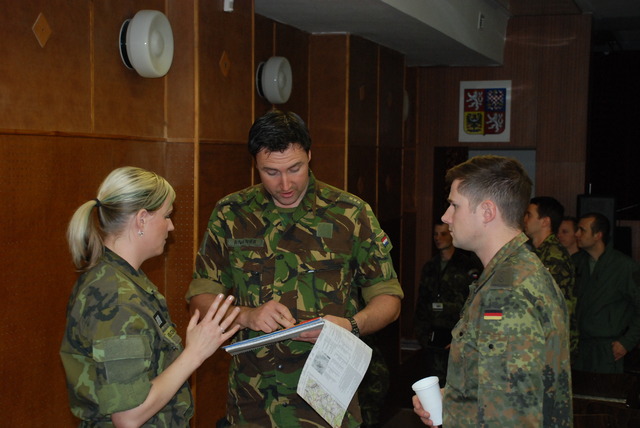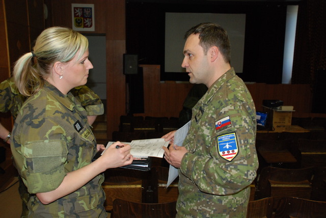 Prap. Iva Musilová ze 22. základny vrtulníkového letectva při rozhovoru se slovenským kolegou o logistickém zabezpečení cvičení