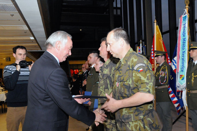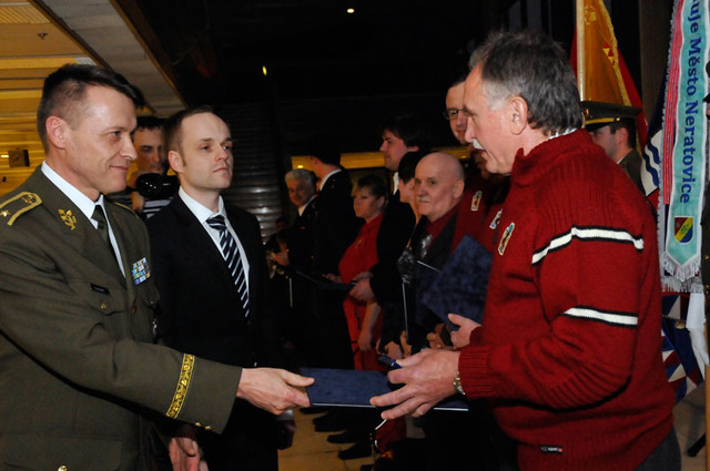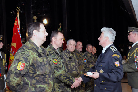 Blahopřání k udělenému ocenění přebírá od místopředsedy Senátu PČR příslušník Aktivní zálohy AČR mjr. Milan Mojžíš