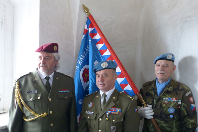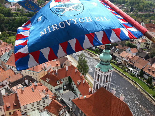 Historický modrý prapor Výcvikové základny mírových sil v Českém Krumlově zavlál nad městem