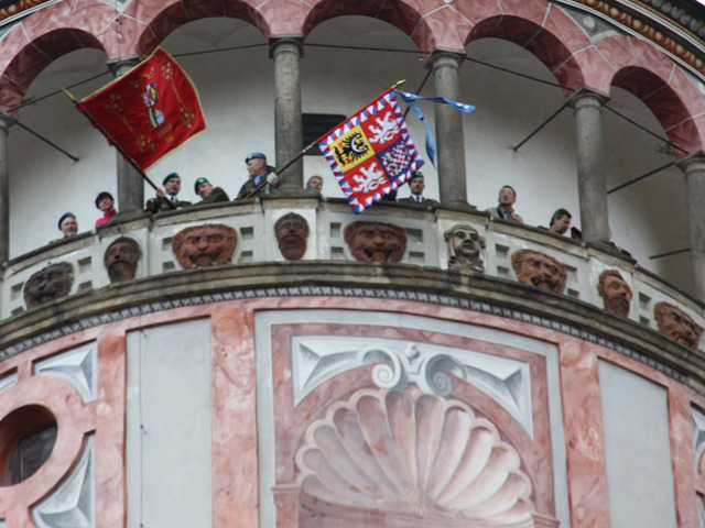 Mnozí z účastníků využili možnosti nechat se vyfotografovat před rozvinutým modrým praporem ve věži českokrumlovského zámku