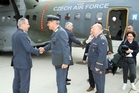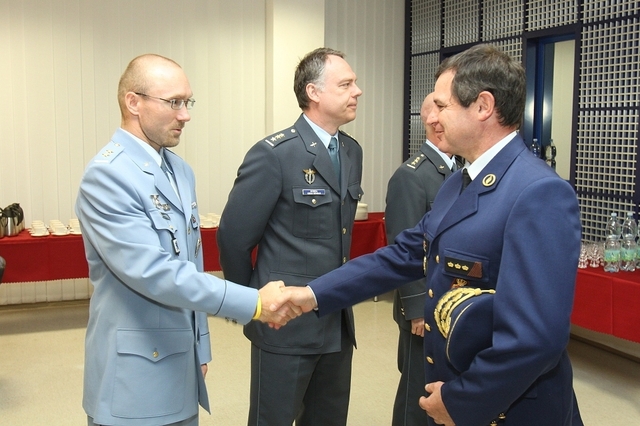 Zástupce velitele 21. KřTL pplk. David Kudrna (vlevo) a velitel 21. KřTL plk. Martin Nezbeda (uprostřed) vítají národní přidělence NATO
