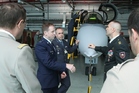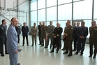 Zástupce velitele 21. KřTL podplukovník David Kudrna (vlevo) seznamuje s prostorem a systémem údržby a oprav letecké techniky