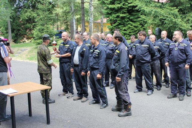 Velitel vítězného družstva z VHJ Jince Petr Mareš přebírá pohár od pplk. Lubomíra Skaličky